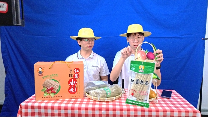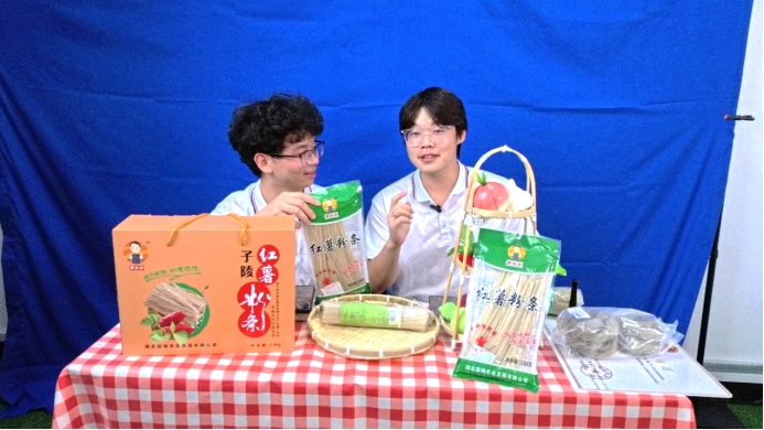 直播当日,学生主播们轮番上阵,凭借课堂所学的市场营销知识和出色的表达能力,热情推介红薯粉。“这款红薯粉来自荆门,当地种红薯有百年历史了,沙质土和温润气候养出的红薯淀粉足、糖分高。从选种到收获全靠农户时令照料,挖出来的红薯经晾晒、石磨磨浆、沉淀过滤,再经漏粉、蒸煮、晾晒等十多道传统工序,才成了这红薯粉。它无添加,米白色透着自然光泽,煮着不浑汤,口感爽滑筋道,久煮不烂还吸汤汁。 夏天吃超合适:酸辣粉炝香调味,拌上花生香菜;凉调粉过凉水,配黄瓜丝麻酱;煮火锅、做汤粉也都好吃!”主播们一边分享背后的故事,一边推荐夏日清凉吃法。