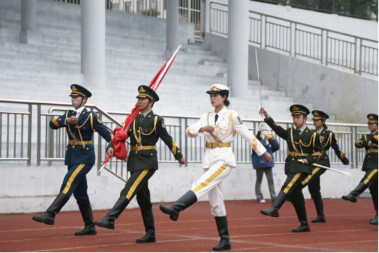 迎着朝阳,伴着晨曦。上午七时,校国旗护卫队踏着铿锵有力的步伐,整齐划一地迈向升旗台。在全体人员的注目礼中,五星红旗冉冉升起,在晨风中高高飘扬、熠熠生辉,全体师生庄严肃立,面向国旗行注目礼。