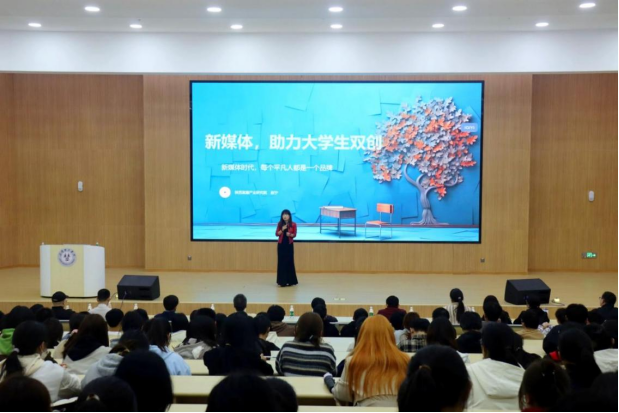 赵老师以自身经历为例,向在场的大学生们展示了新媒体在创新创业中的巨大潜力。她首先介绍了后疫情时代新媒体、短视频、直播后的变化,为同学们指出了未来直播电商流量的趋势、如何参与新媒体运营的双创之路以及传统行业如何快速入局短视频直播赛道等新媒体的时机和技巧。随后,赵老师还分享了一些新媒体创新创业的成功案例,并通过案例,现身说法短视频拍摄与文案设计,为学生讲解了手机拍摄的各种注意事项。让大学生们更加直观地了解到了新媒体创新创业的可行性和前景。她鼓励大学生们要敢于尝试、勇于创新,积极利用新媒体平台为自己的创新创业梦想插上翅膀。最后,她就师生如何乘上“电商直播”的直通车,让电商直播为乡村振兴赋能,共促电商行业数字化高质量发展提出建议。